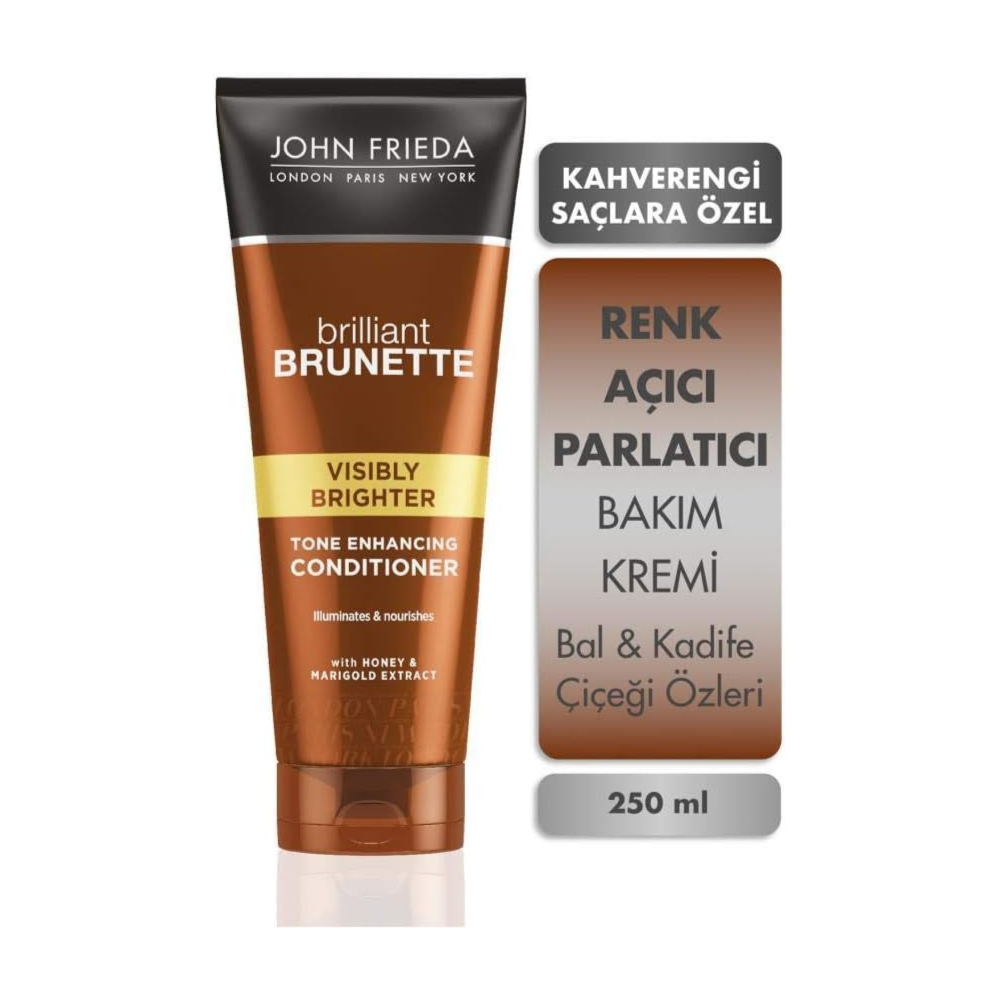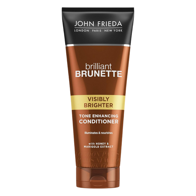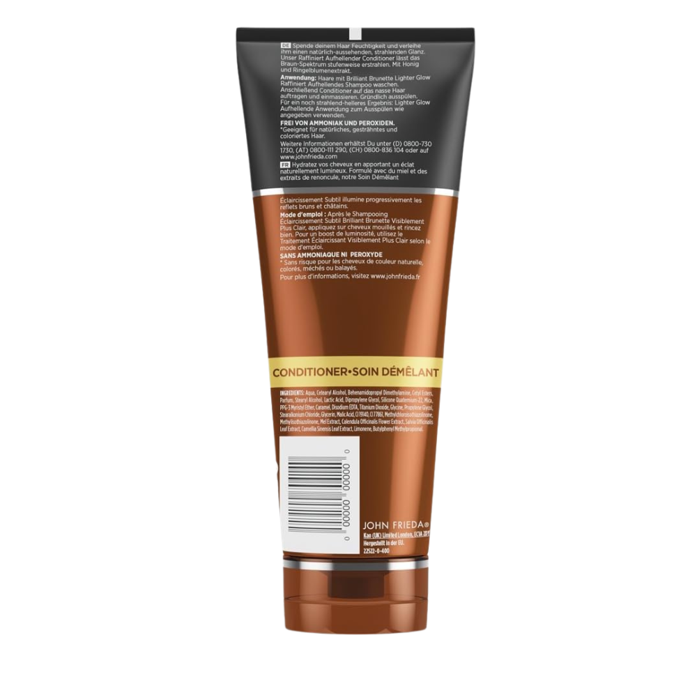 John Frieda Brilliant Brunette Visibly Brighter Lightening Conditioner 250ml is a hair care product designed to gradually lighten and enhance natural or color-treated brunette hair. This conditioner nourishes and hydrates while subtly brightening hair with each use, creating a warm, sun-kissed glow. It's ideal for those looking to add dimension and luminosity to their brunette locks.