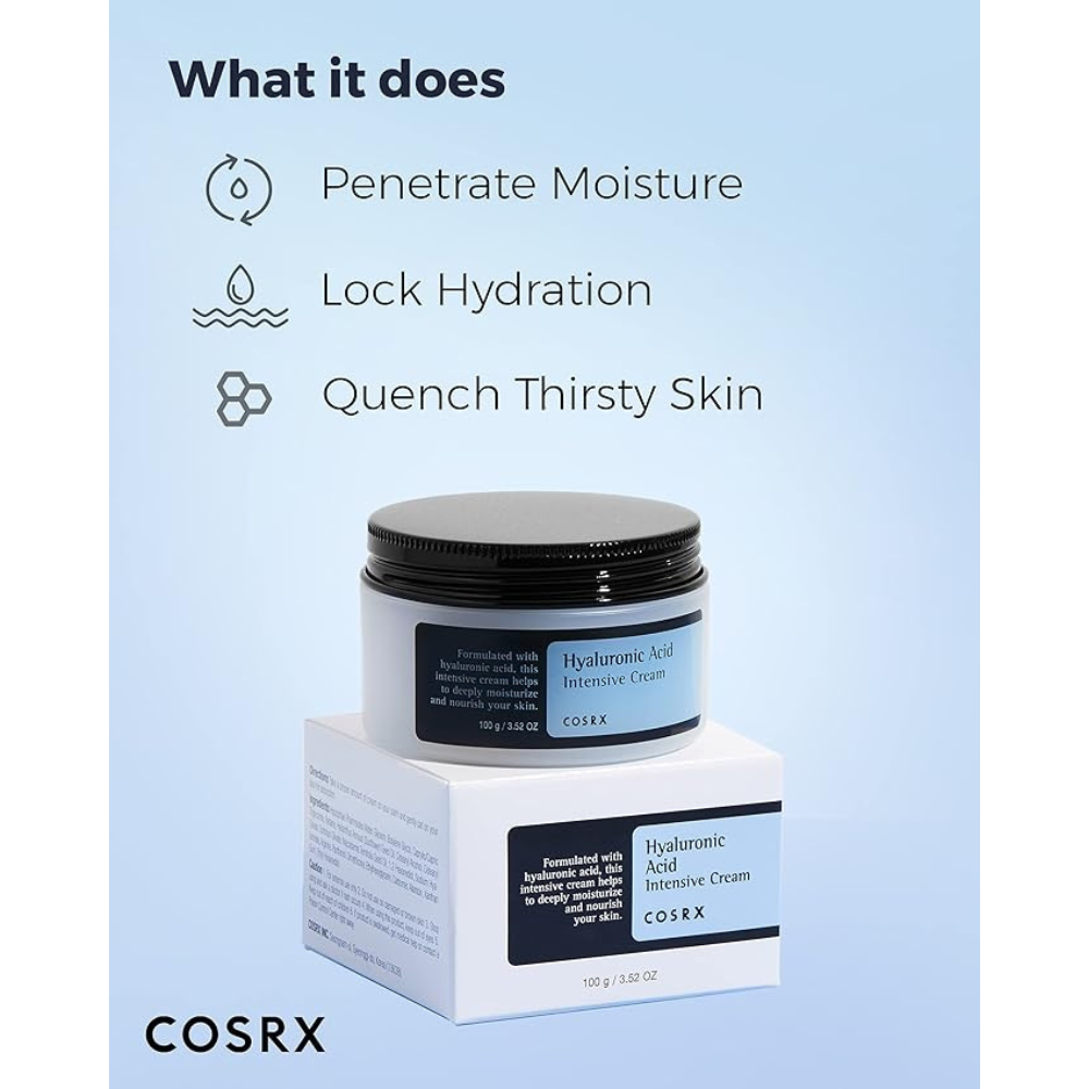 - Recharge and Lock in Moisture: COSRX Hyaluronic Acid Intensive Cream is designed to deliver moisture deep into your skin. Locking the moisture into your skin, the cream provides long-lasting nourishment and hydration.