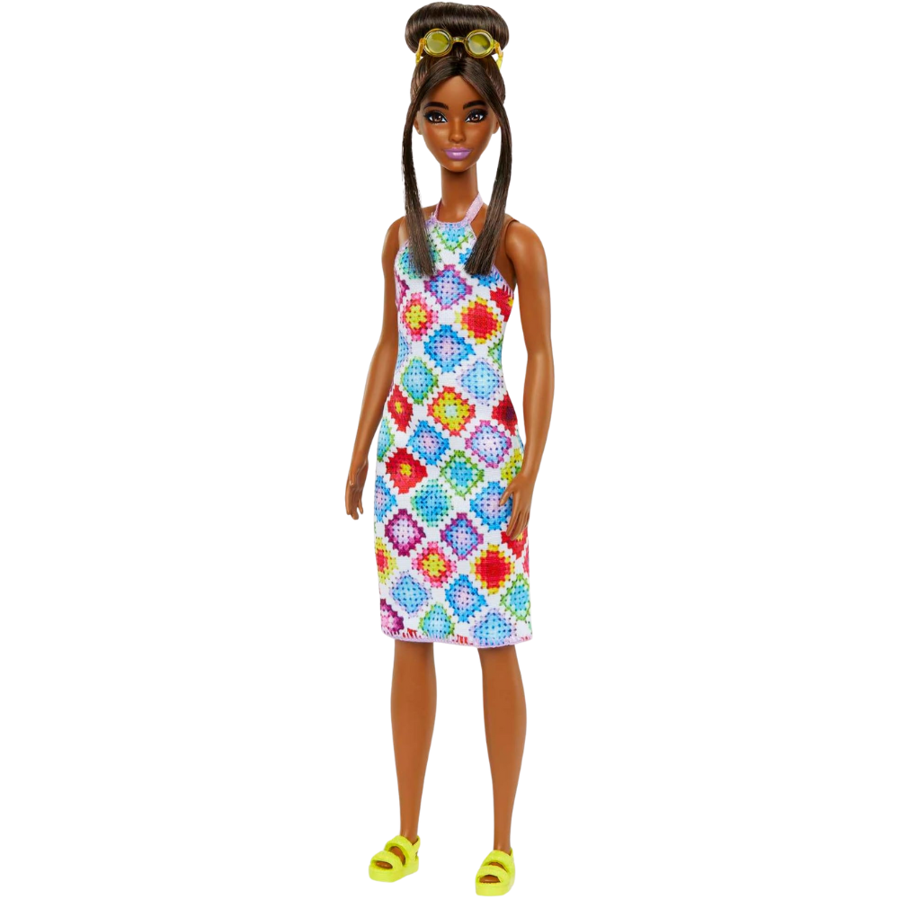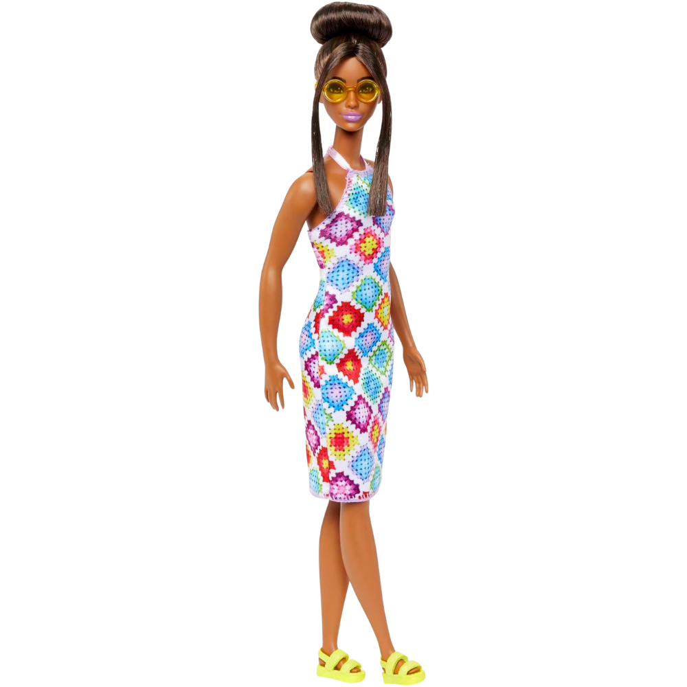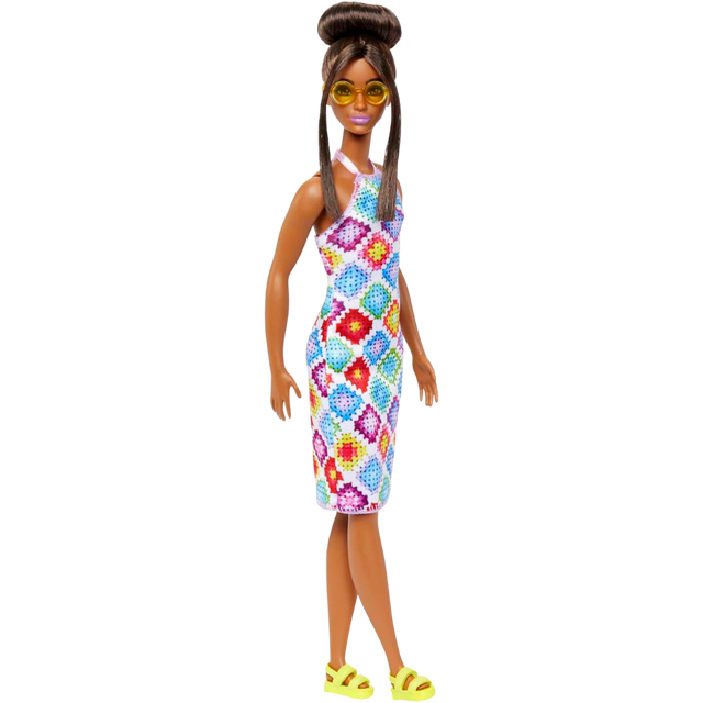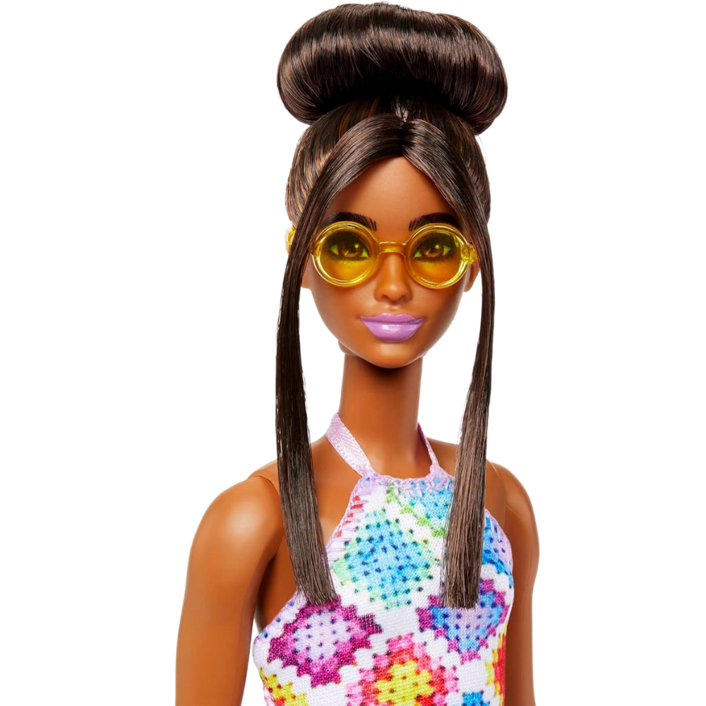- This Barbie doll styles her dark brown hair in a glamorous bun with front pieces framing her face. Golden circle sunglasses and chunky yellow sandals make her personality pop!