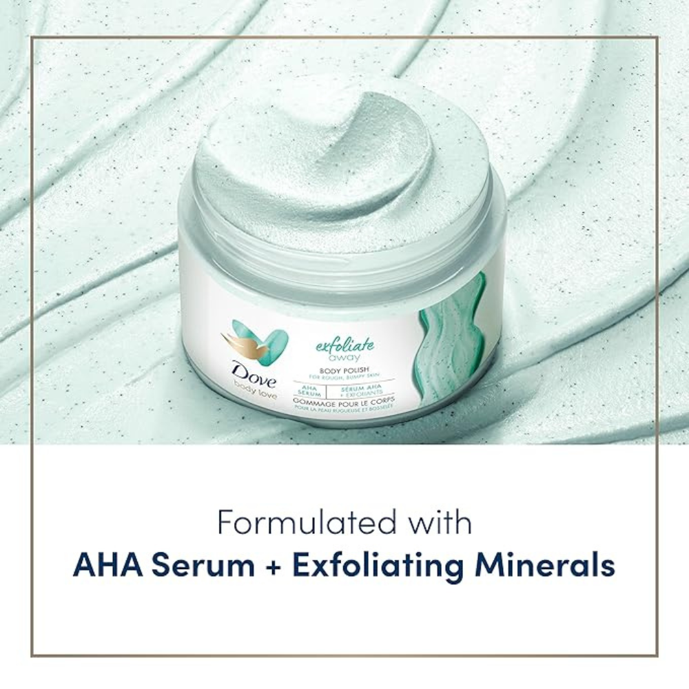 - EXFOLIATE AWAY: Dove Exfoliate Away Body Polish exfoliates and refines your skin in the shower to reveal silky soft skin