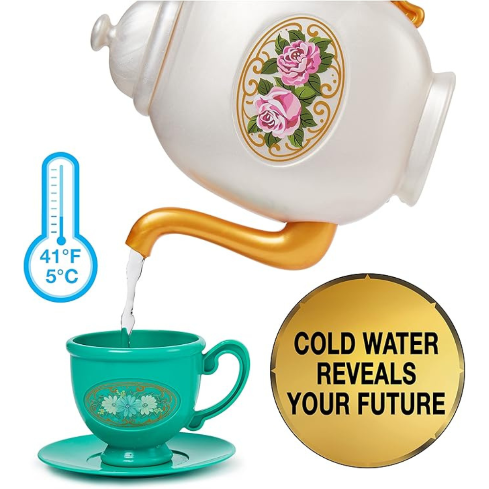- COLD WATER REVEAL: Pour cold water from the teapot into one of the teacups and have a friend read your tea leaves! Reveal symbols like the sun for great happiness, a heart for love and The Grim!
